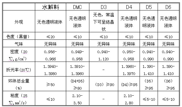 (一)二甲基二氯硅烷水解物(簡(jiǎn)稱水解物或水解料),其是一種以二甲基二氯硅烷為主要原料,經(jīng)過(guò)水解合成工序制得的或者在此基礎(chǔ)上再經(jīng)過(guò)分離、裂解、精餾后制得的一種以六甲基環(huán)三硅氧烷(D3)、八甲基環(huán)四硅氧烷(D4)、十甲基環(huán)五硅氧烷(D5)和十二甲基環(huán)六硅氧烷(D6)為主的混合物,其中六甲基環(huán)三硅氧烷(D3)及或八甲基環(huán)四硅氧烷(D4)及或十甲基環(huán)五硅氧烷(D5)及或十二甲基環(huán)六硅氧烷(D6)的含量達(dá)到50%以上。