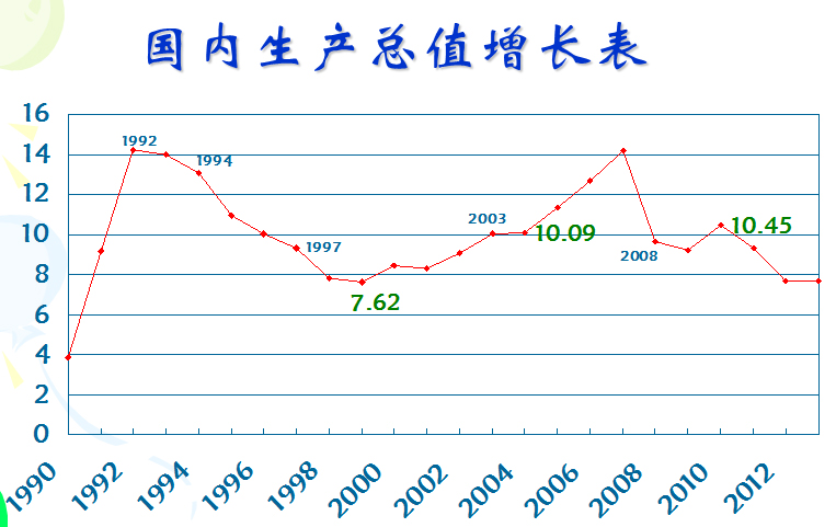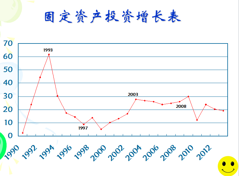 第一波投資潮始于1990年,1993年到了最高峰。這波投資潮給中國帶來了什么影響呢?第一波投資潮給中國經(jīng)濟(jì)帶來的影響。GDP增長率1992年、1993年、1994年三年的增長率高于13%,高速的經(jīng)濟(jì)增長,曾經(jīng)創(chuàng)造了中國奇跡。再看第二個(gè)數(shù)據(jù),124.1 它又是什么呢?它是“全國居民消費(fèi)價(jià)格指數(shù)”,從90年代開始,我們的“全國居民消費(fèi)價(jià)格指數(shù)”一路攀升,一直到1994年達(dá)到頂峰,F(xiàn)來看下一組數(shù)據(jù),87億,87億是當(dāng)年海南省的房地產(chǎn)投資額,占到這個(gè)省的固定資產(chǎn)投資額的一半,當(dāng)時(shí)海南省的房地產(chǎn)創(chuàng)造了海南神話。可以看出當(dāng)年海南省的房地產(chǎn)是多么多么的火爆。但是接下來的爛尾樓和資金積壓量就可以看到當(dāng)時(shí)的房地產(chǎn)泡沫,416幢的爛尾樓,8百多個(gè)億的資金積壓,當(dāng)年海南省的房地產(chǎn)只是中國房地產(chǎn)一個(gè)小小的縮影。第一波投資潮給中國經(jīng)濟(jì)帶來的到底是什么?首先是經(jīng)濟(jì)的高速增長,但是緊接著來的就是嚴(yán)重的通貨膨脹和房地產(chǎn)泡沫。