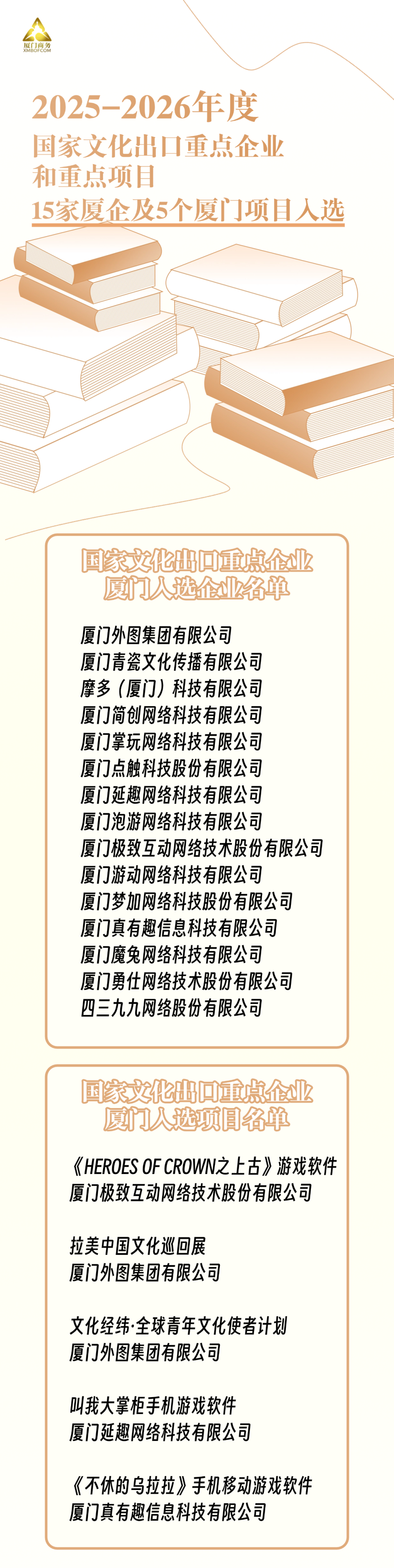 日前,商務(wù)部等四部門發(fā)布公告,我會(huì)會(huì)員企業(yè)廈門外圖集團(tuán)有限公司榮獲“2025—2026 年度國(guó)家文化出口重點(diǎn)企業(yè)”稱號(hào),其“拉美中國(guó)文化巡回展”及“文化經(jīng)緯?全球青年文化使者計(jì)劃”入選“2025—2026 年度國(guó)家文化出口重點(diǎn)項(xiàng)目”。